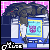 Description: ravage draped over soundwave in his alt-mode, with the word "Mine" at the bottom